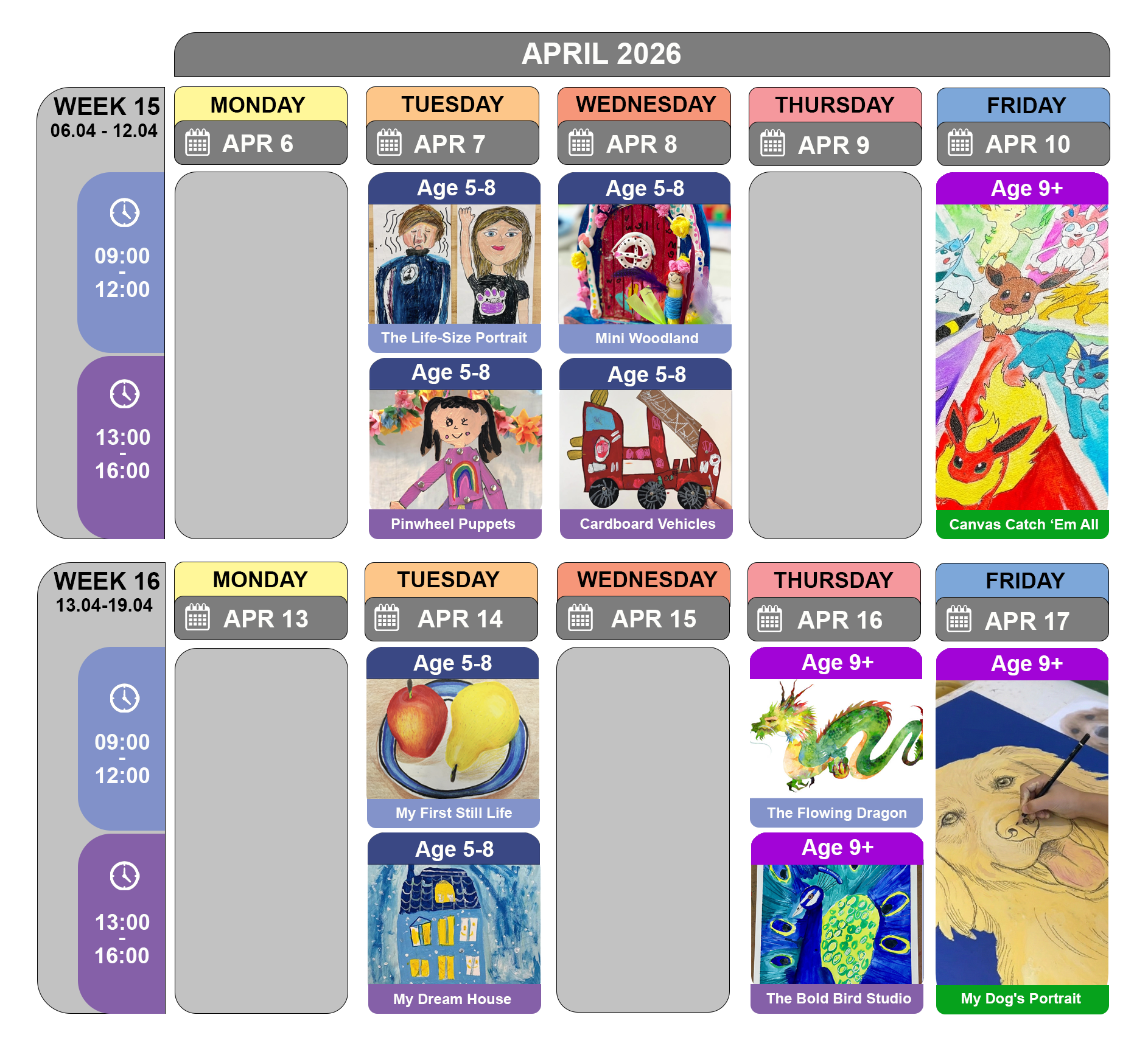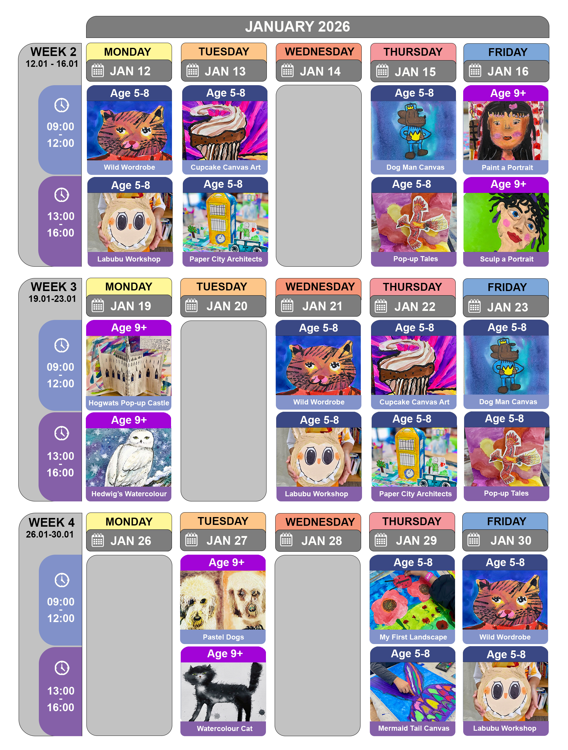 Important Note - Double Sessions: if you're enrolled for two sessions on the same day, your child can stay at the venue between sessions. No need for separate pickups